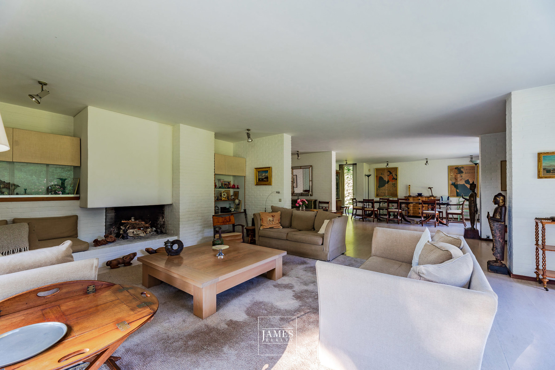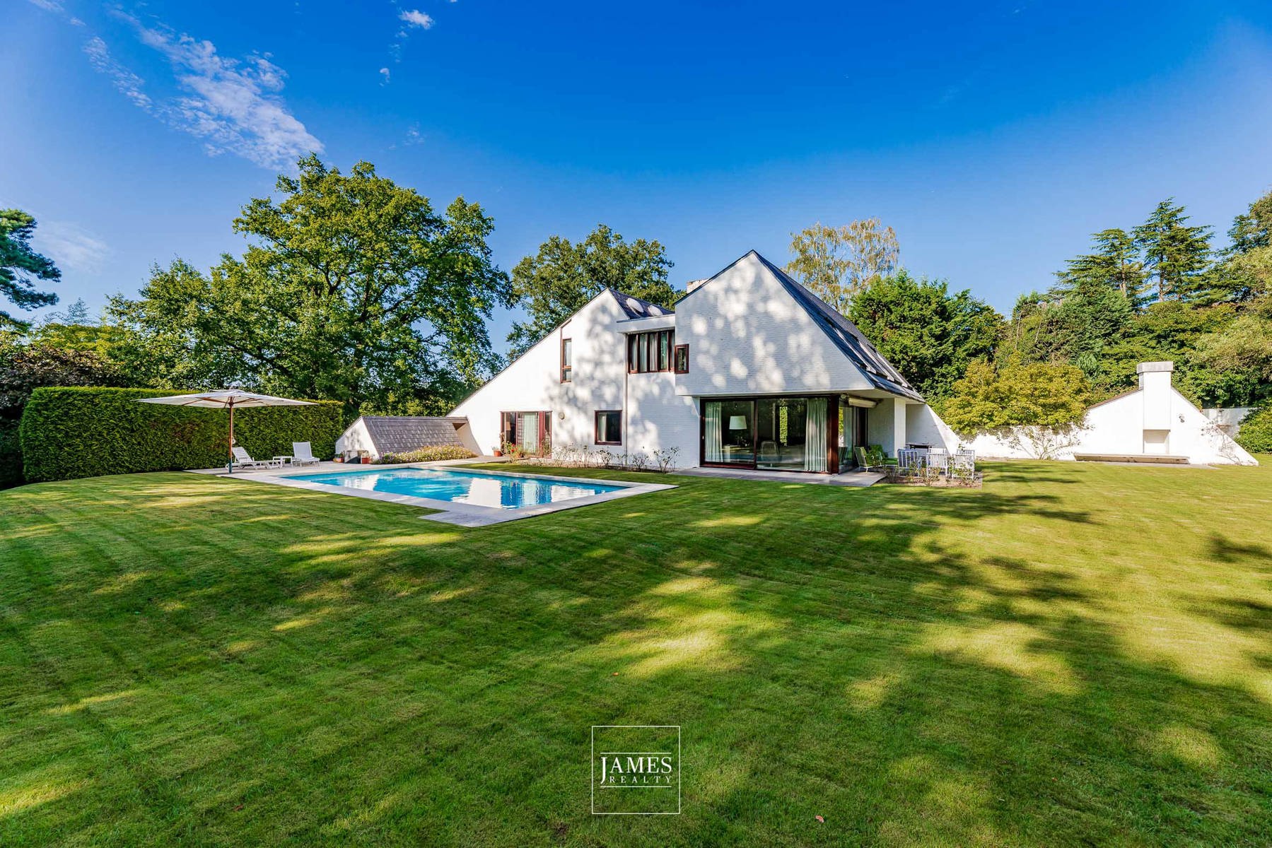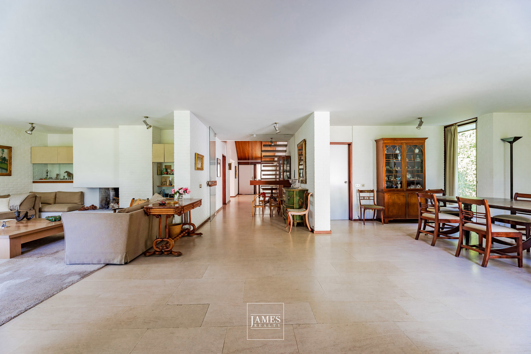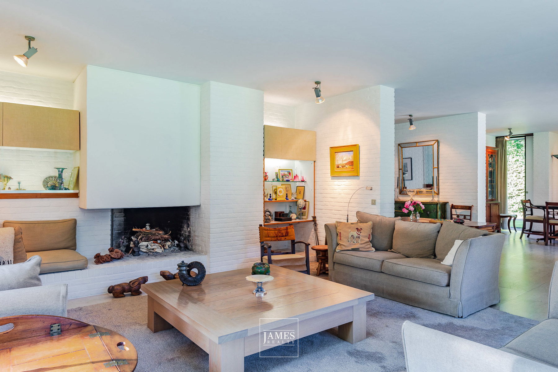 Dans le quartier résidentiel et paisible de la Drève Pittoresque, cette villa de caractère, construite dans les années 1970 par l’architecte moderniste Lucien-Jaques Baucher, est nichée au bout d’une allée privée, à l’abri des regards. Établie sur un terrain arboré de ±27 ares orienté sud-ouest, elle profite d’un beau jardin paysager, de terrasses et d’une piscine extérieure.