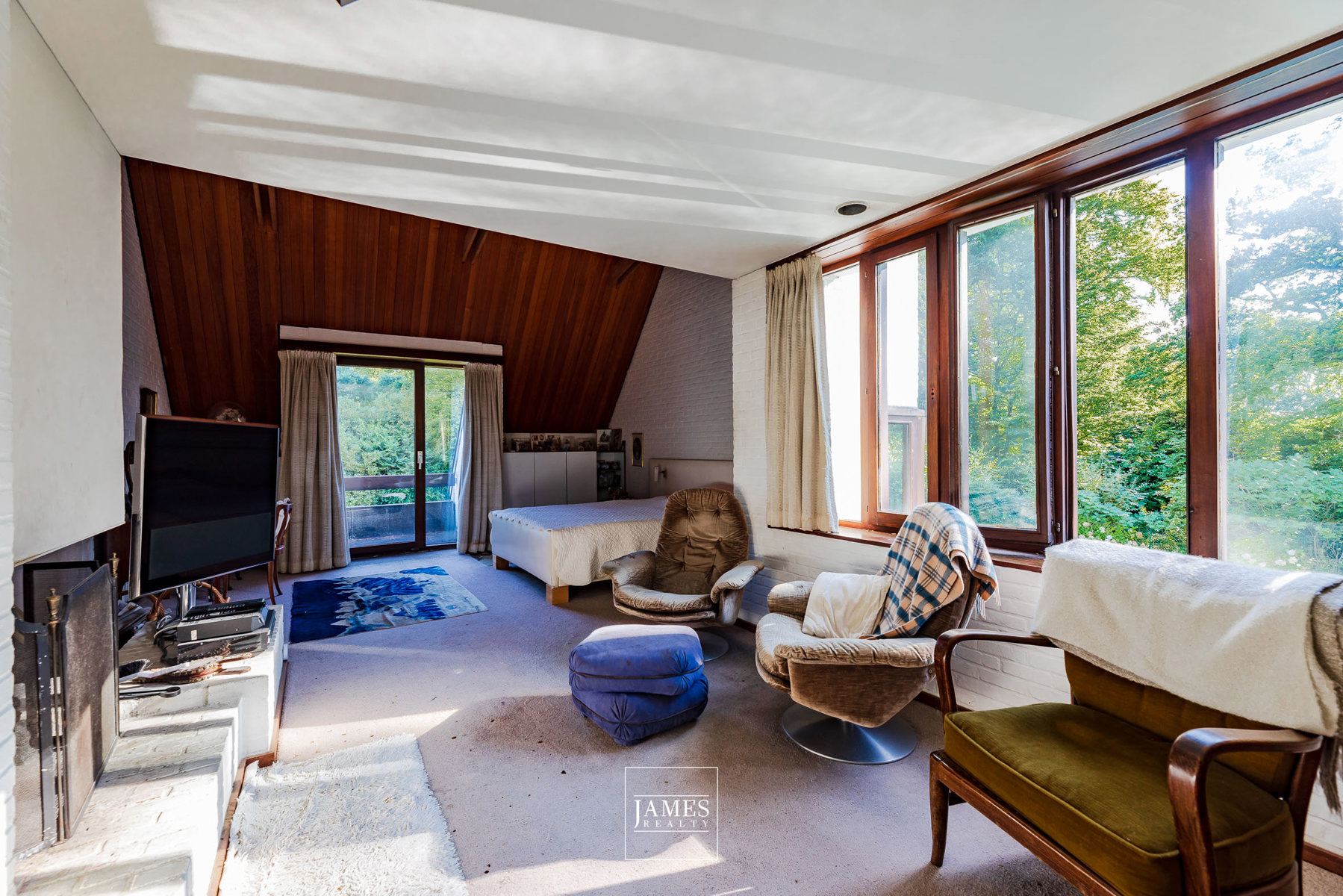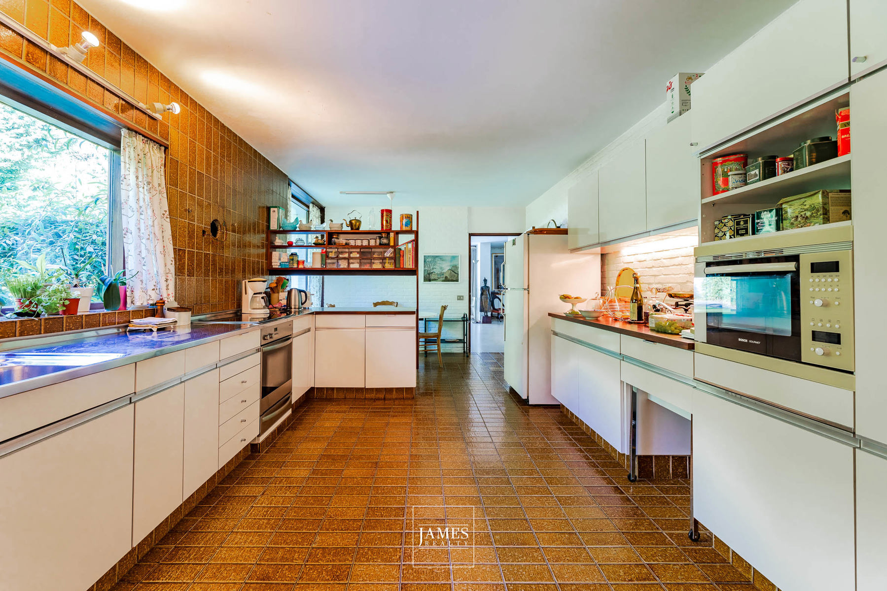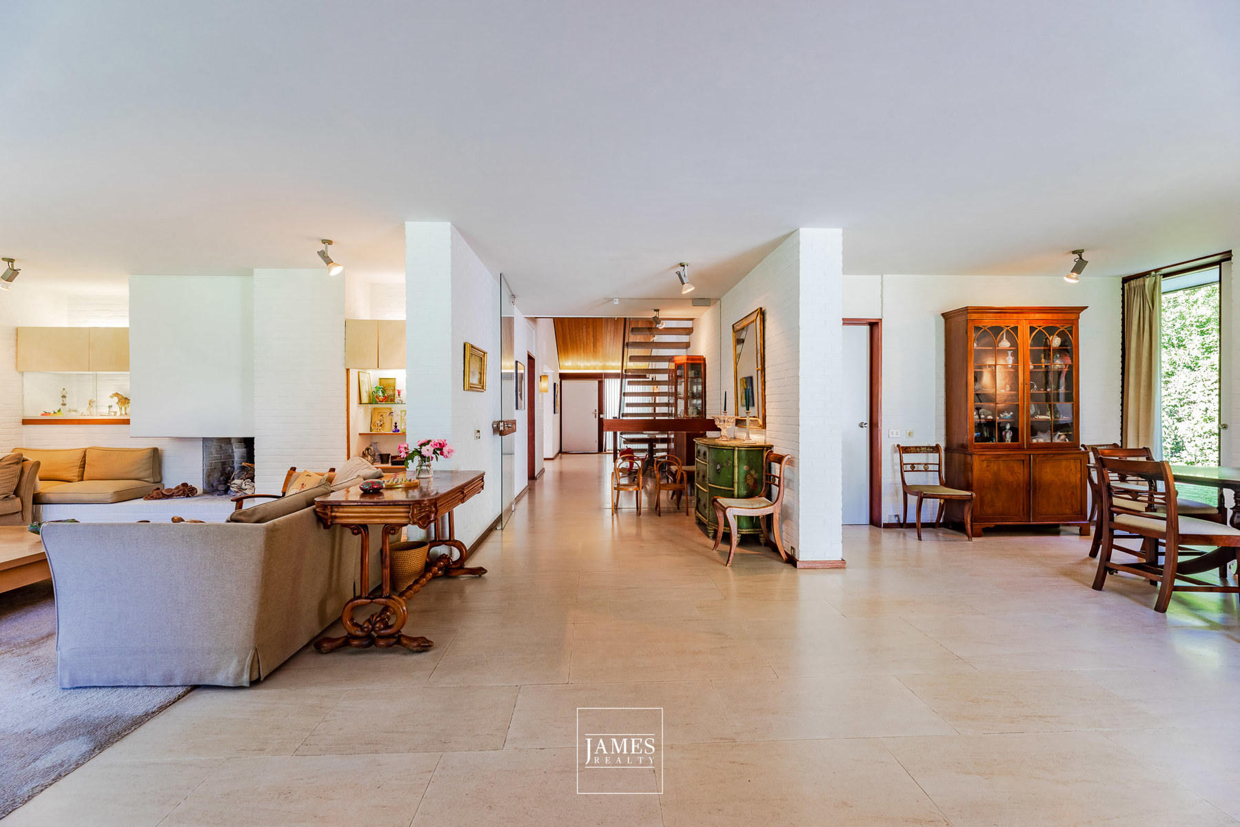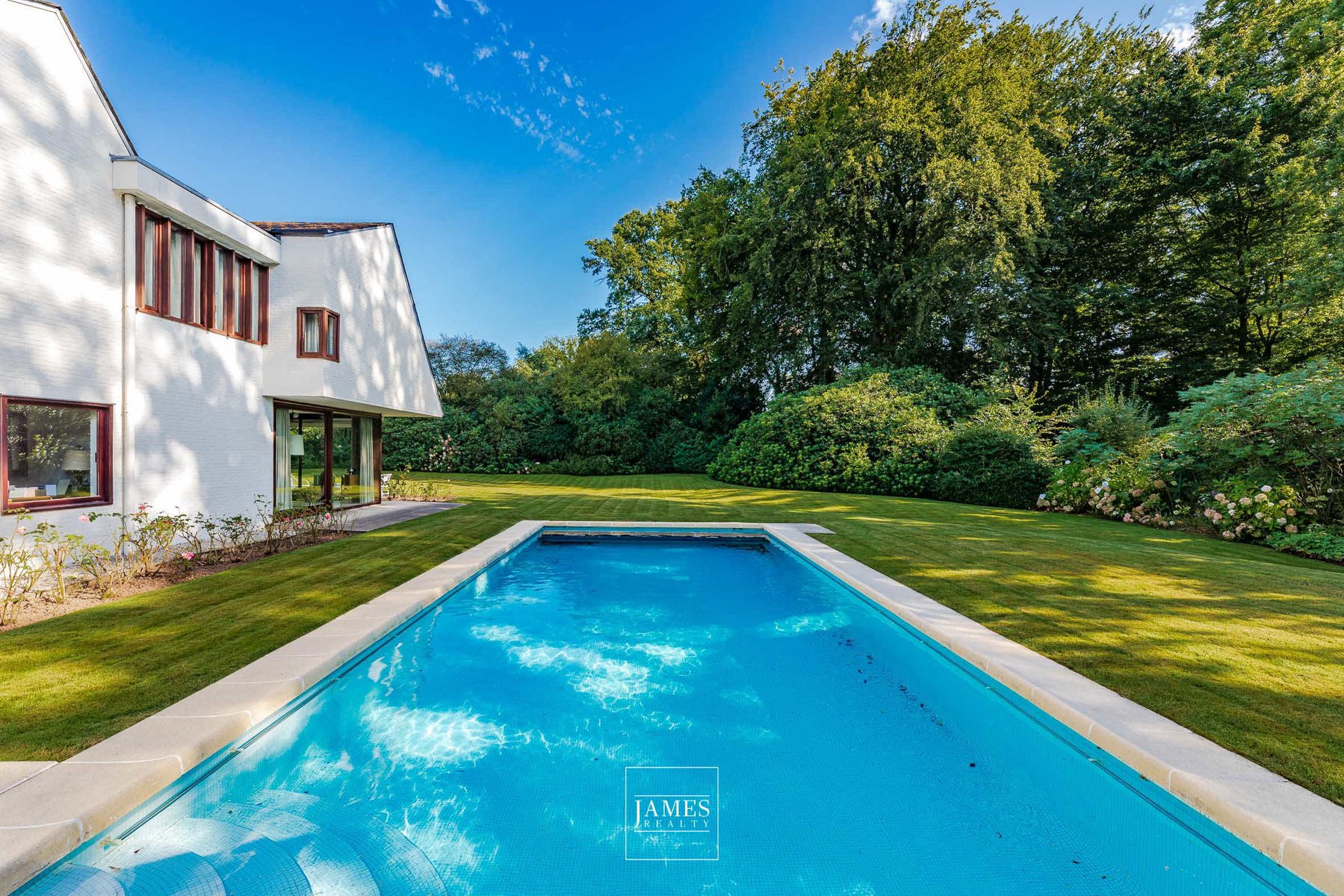 Dans le quartier résidentiel et paisible de la Drève Pittoresque, cette villa de caractère, construite dans les années 1970 par l’architecte moderniste Lucien-Jaques Baucher, est nichée au bout d’une allée privée, à l’abri des regards. Établie sur un terrain arboré de ±27 ares orienté sud-ouest, elle profite d’un beau jardin paysager, de terrasses et d’une piscine extérieure.