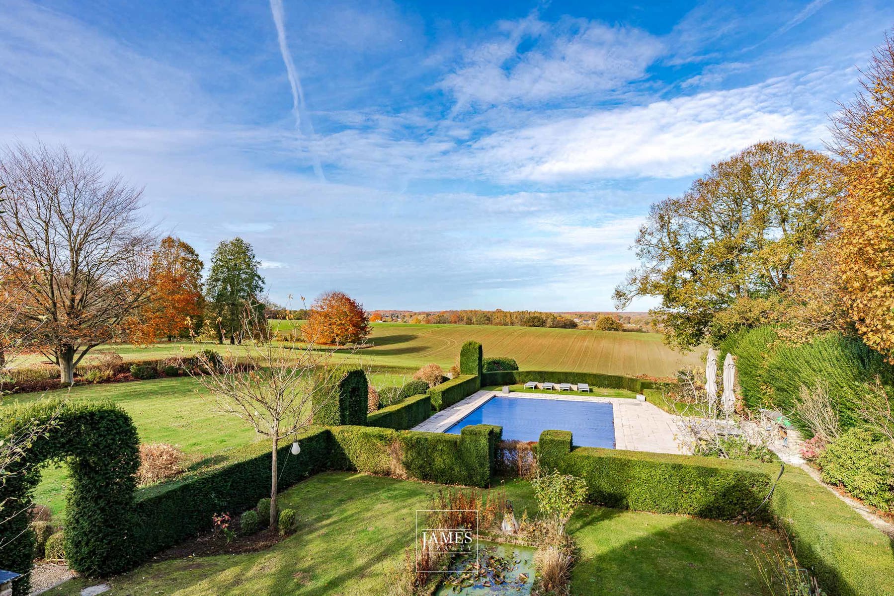 La piscine 14 m × 7 m, entourée d’environ 100 m² de plages, bénéficie d’une vue dégagée exceptionnelle sur les champs. Un éclairage paysager met en scène les massifs dès la nuit tombée.