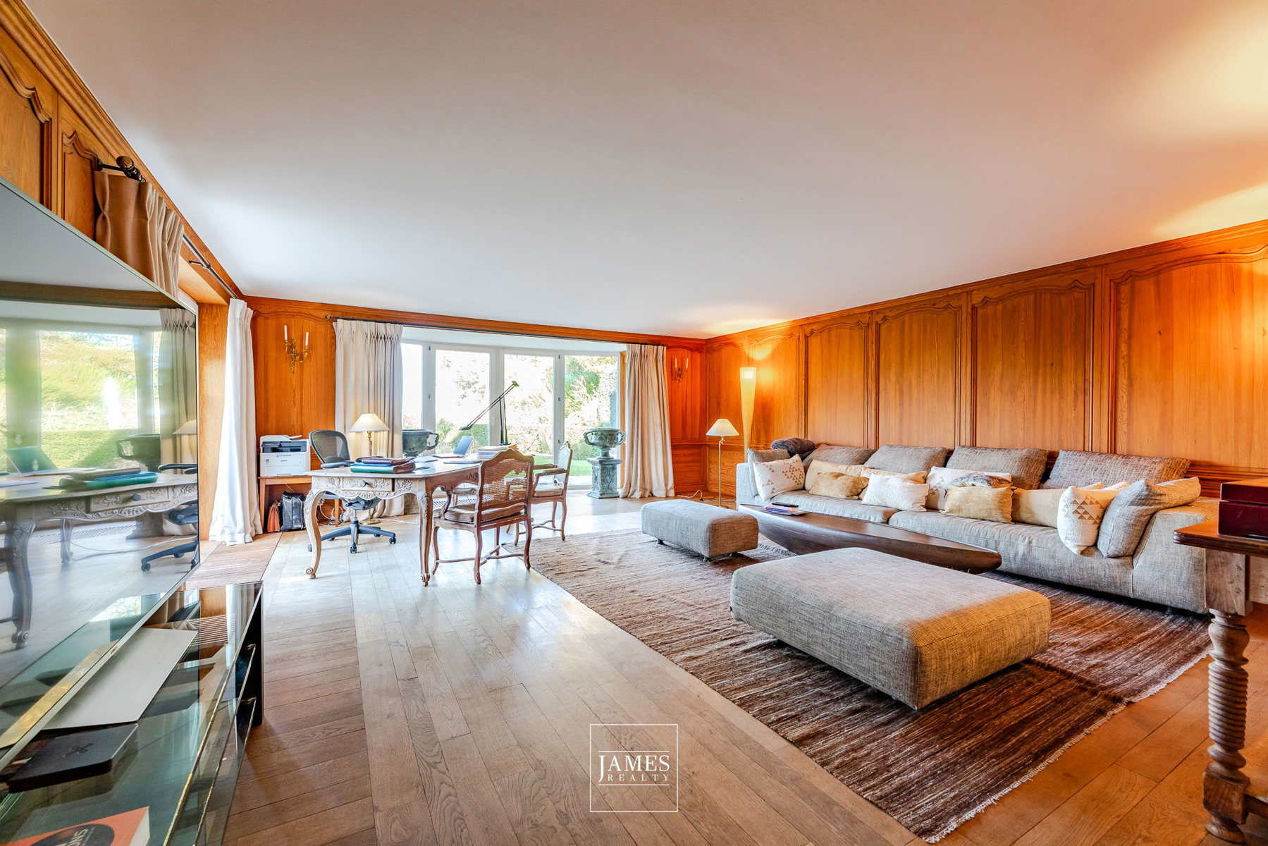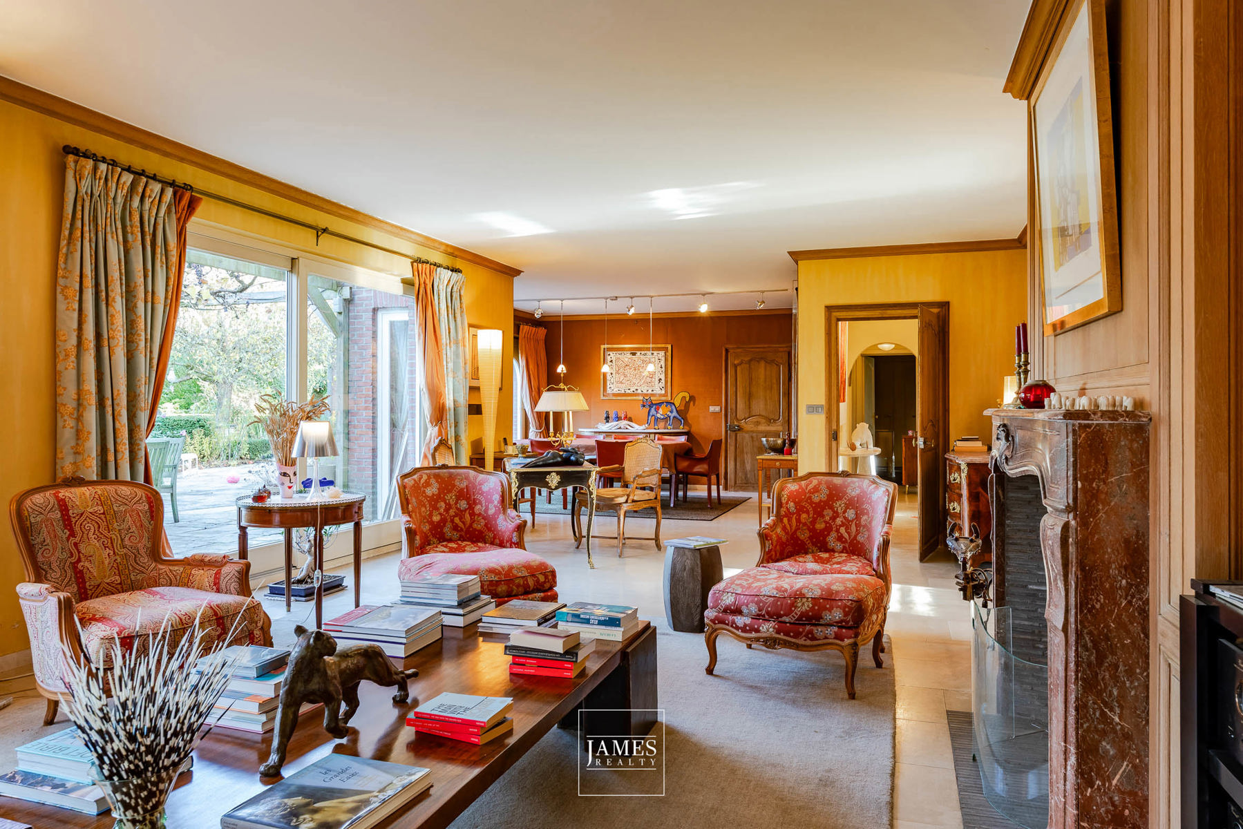 – Le premier orienté jardin, doté de lambris en chêne sur mesure et d’une cheminée Régence XVIIIe fonctionnant au bioéthanol (conduit existant), baigné de lumière et ouvert sur la terrasse.