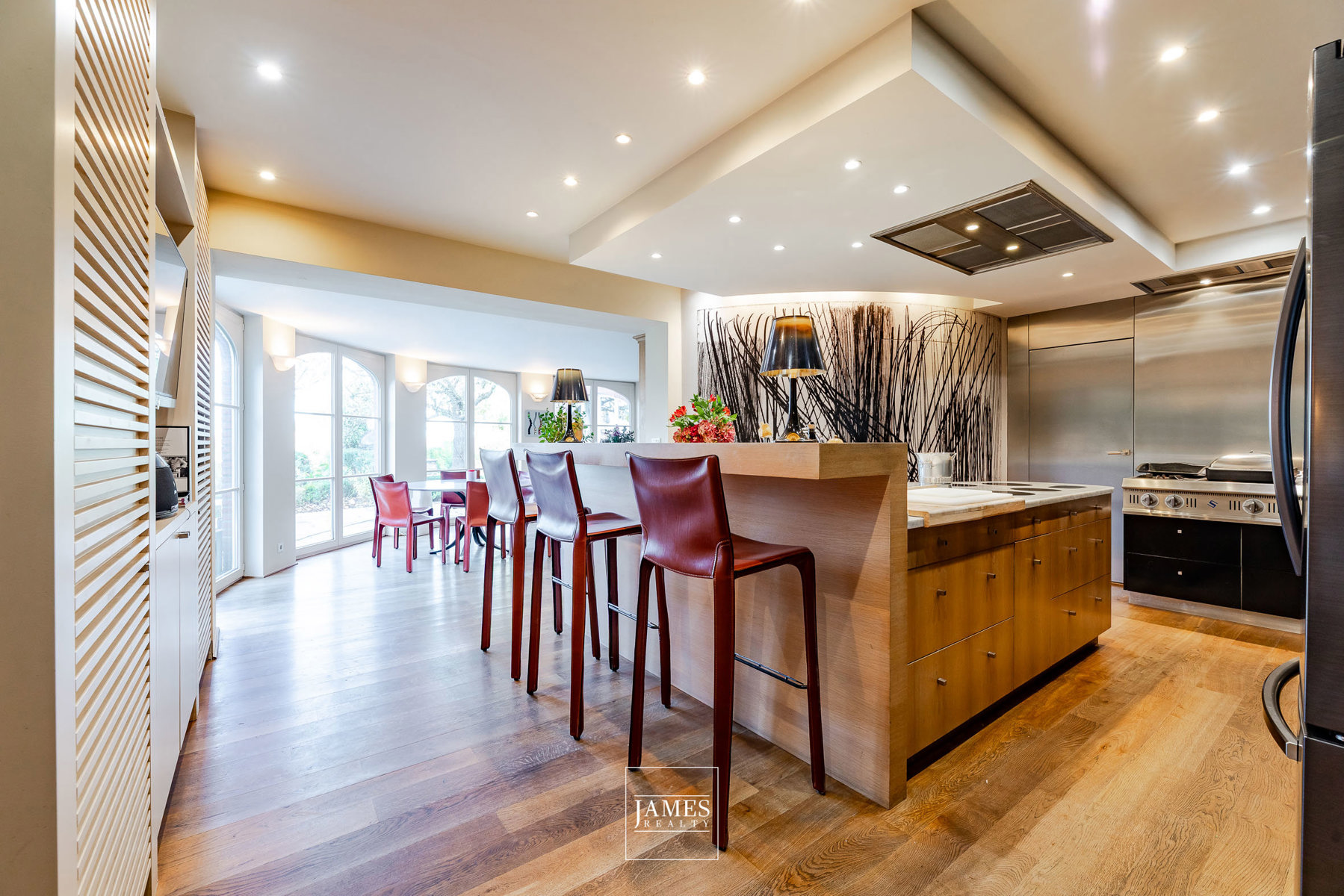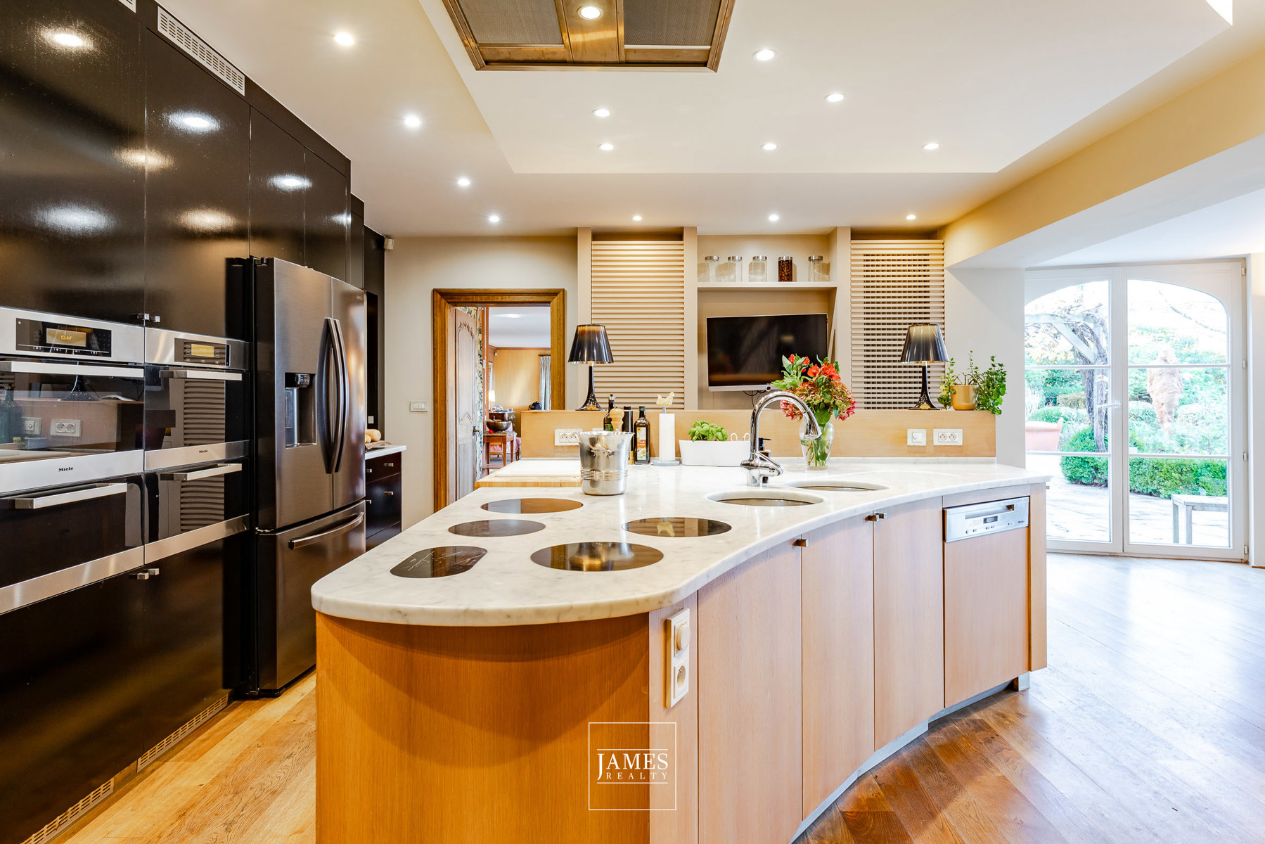 La cuisine de ± 52 m², semi-professionnelle, est organisée autour d’un vaste îlot central avec comptoir-bar et espace repas en rotonde ouvert sur le jardin. Elle est équipée de 2 hottes, 6 plaques induction, fourneau gaz 5 zones et appareils Miele. Une buanderie attenante, discrètement intégrée, complète cet espace.