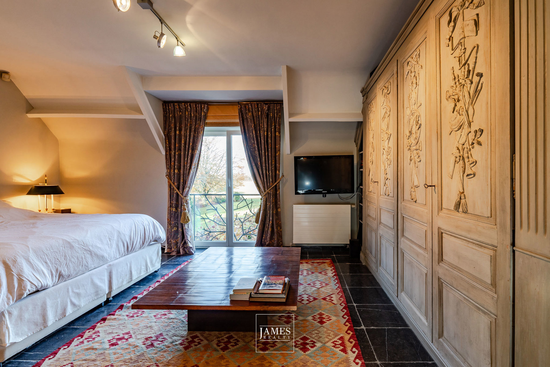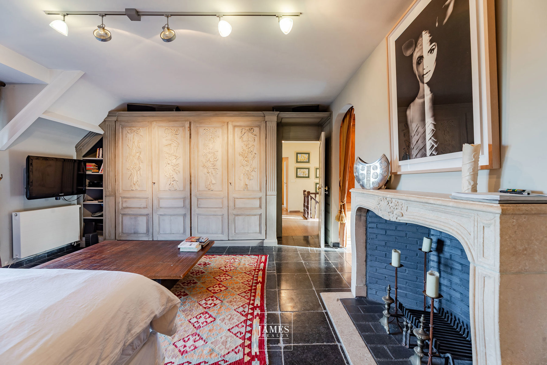 – Chambre 5 : 35 m² sous toiture, mobilier sur mesure, salle de bain, WC séparés, sol en pierre bleue