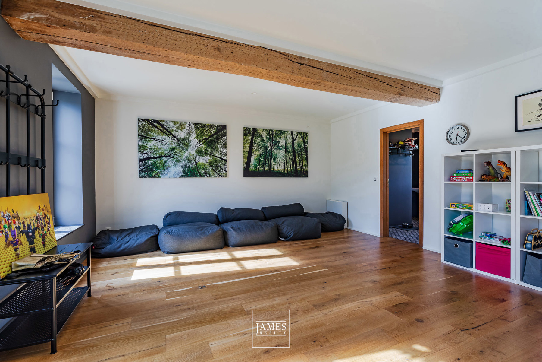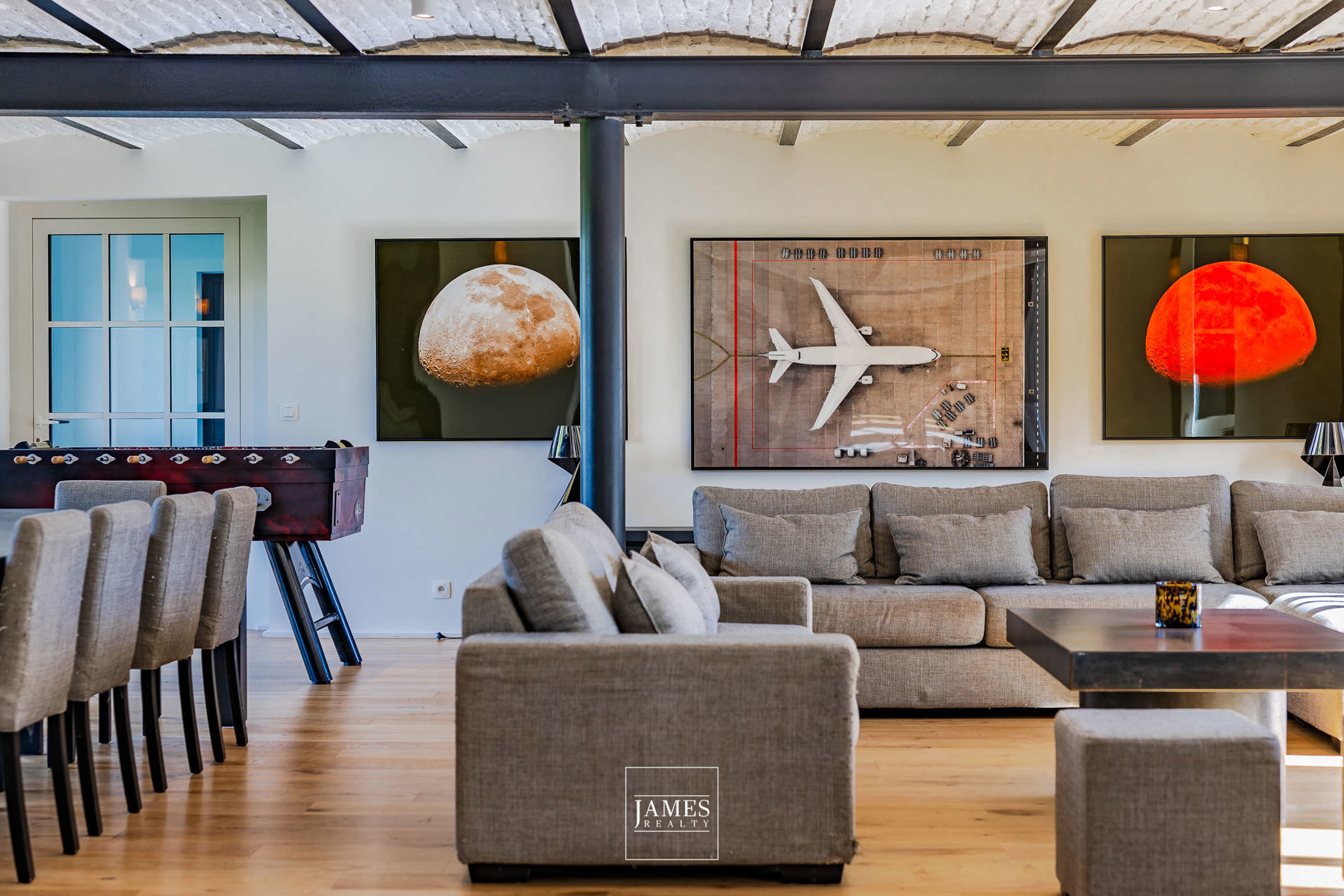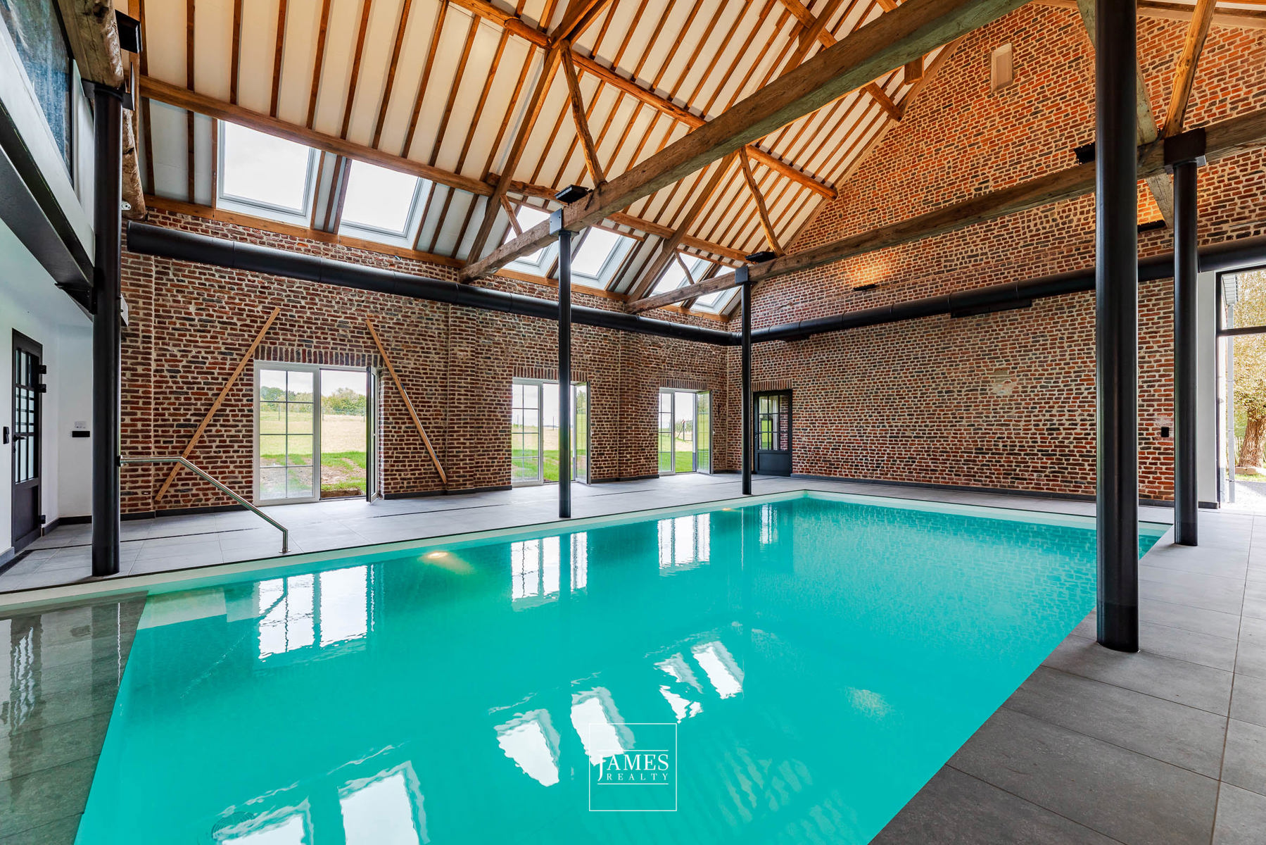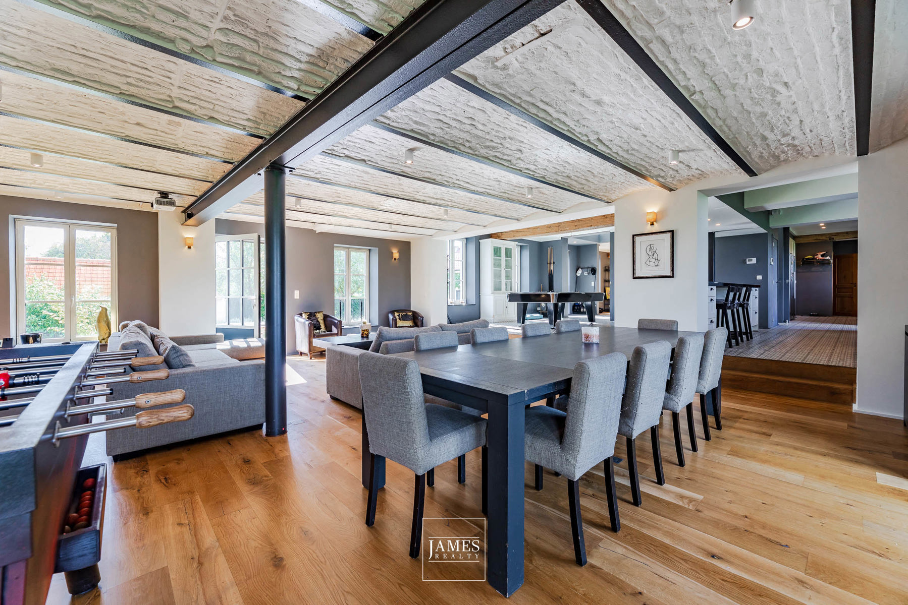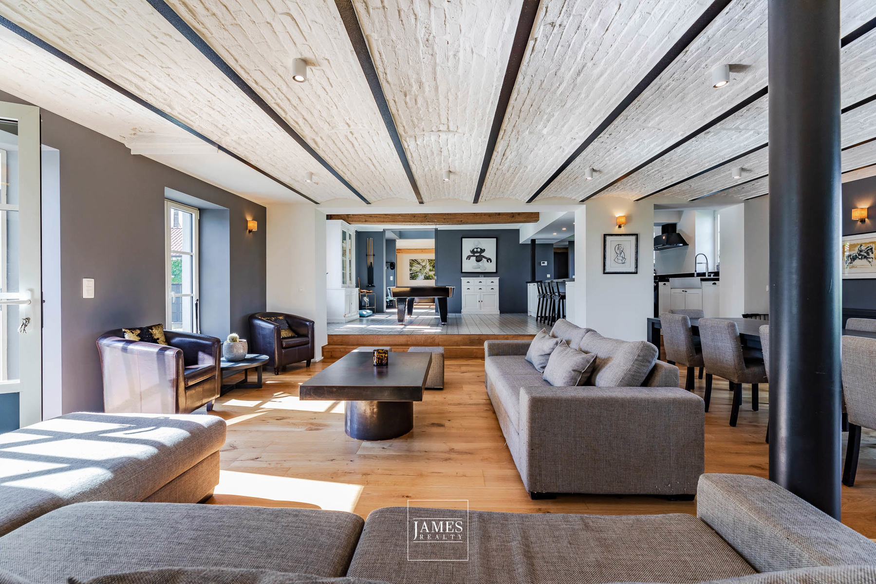 - Plusieurs espaces de vie : salon voûté (poss. feu ouvert), salle à manger, salle TV/jeux, salle de billard