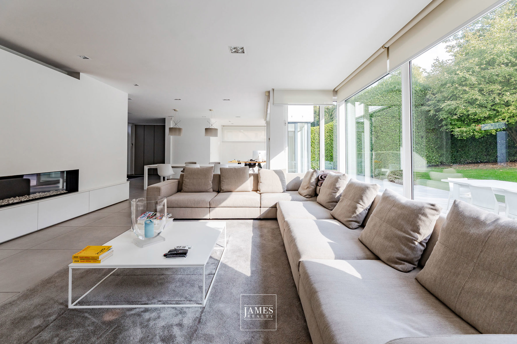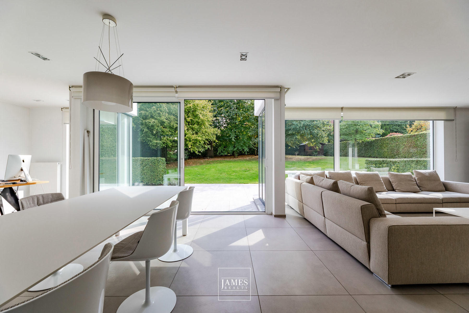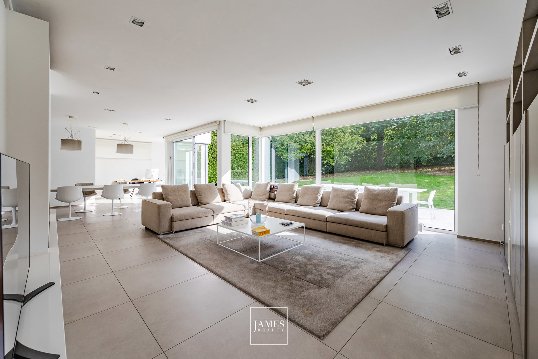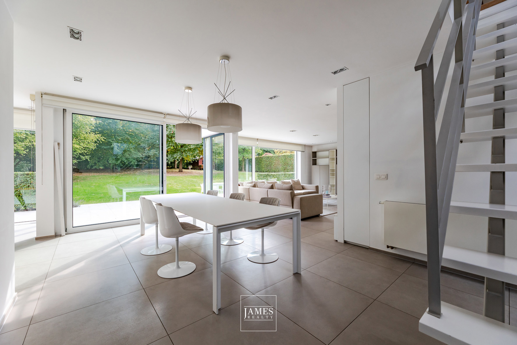 Idéalement située dans le quartier résidentiel du Prince Baudouin à Woluwe-Saint-Pierre, cette villa d’esprit moderne a été rénovée en profondeur en 2014 et développe une superficie d’environ 554 m² sur un terrain de 16 ares joliment planté et arboré avec son petit terrain de pétanque.