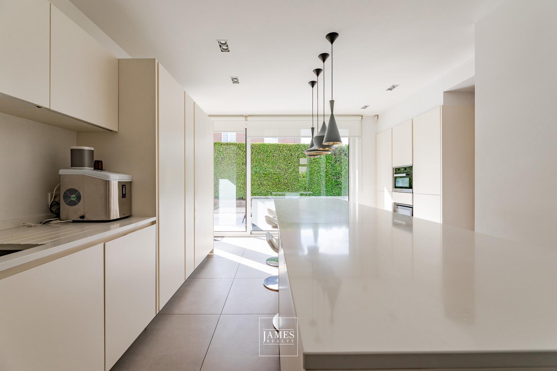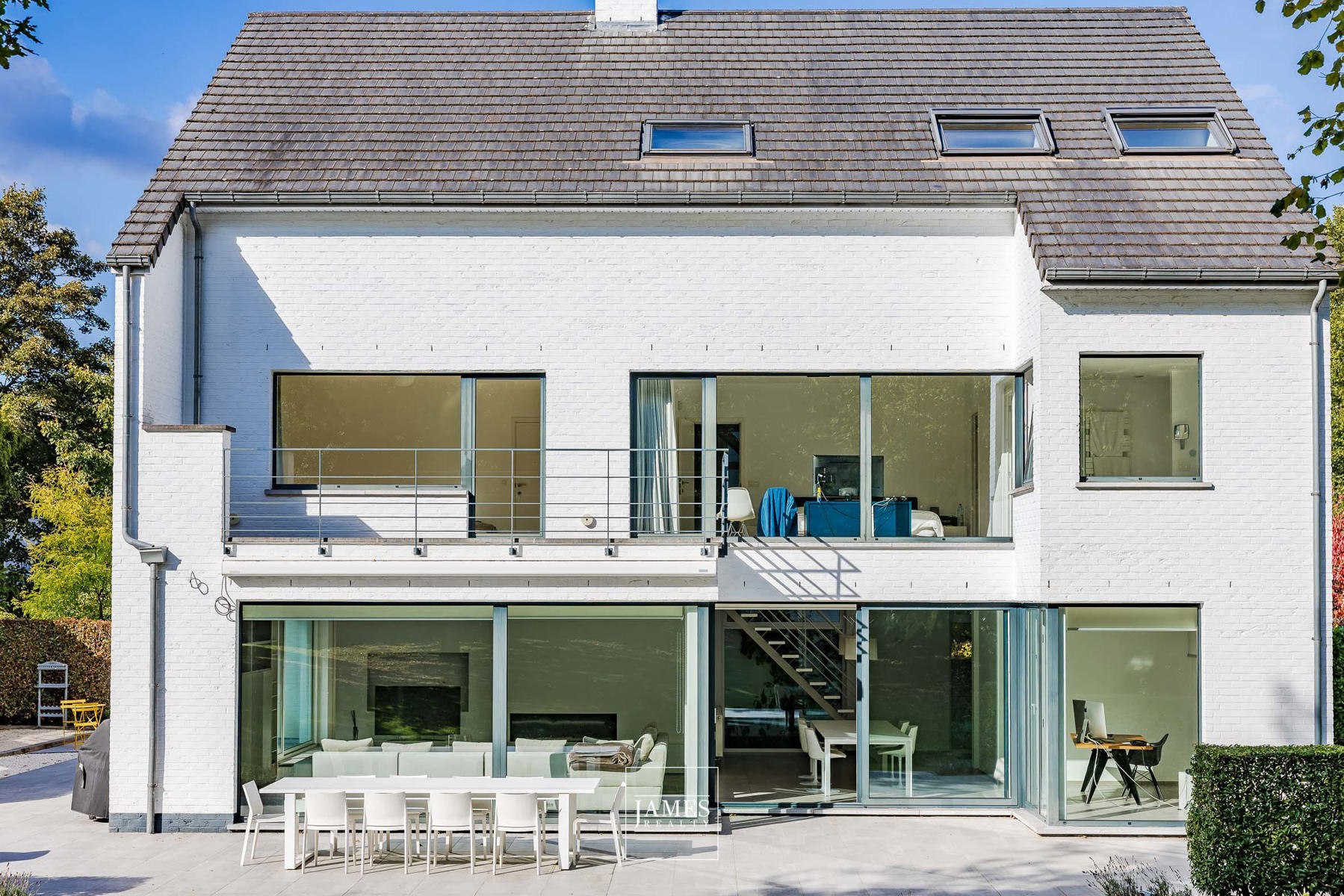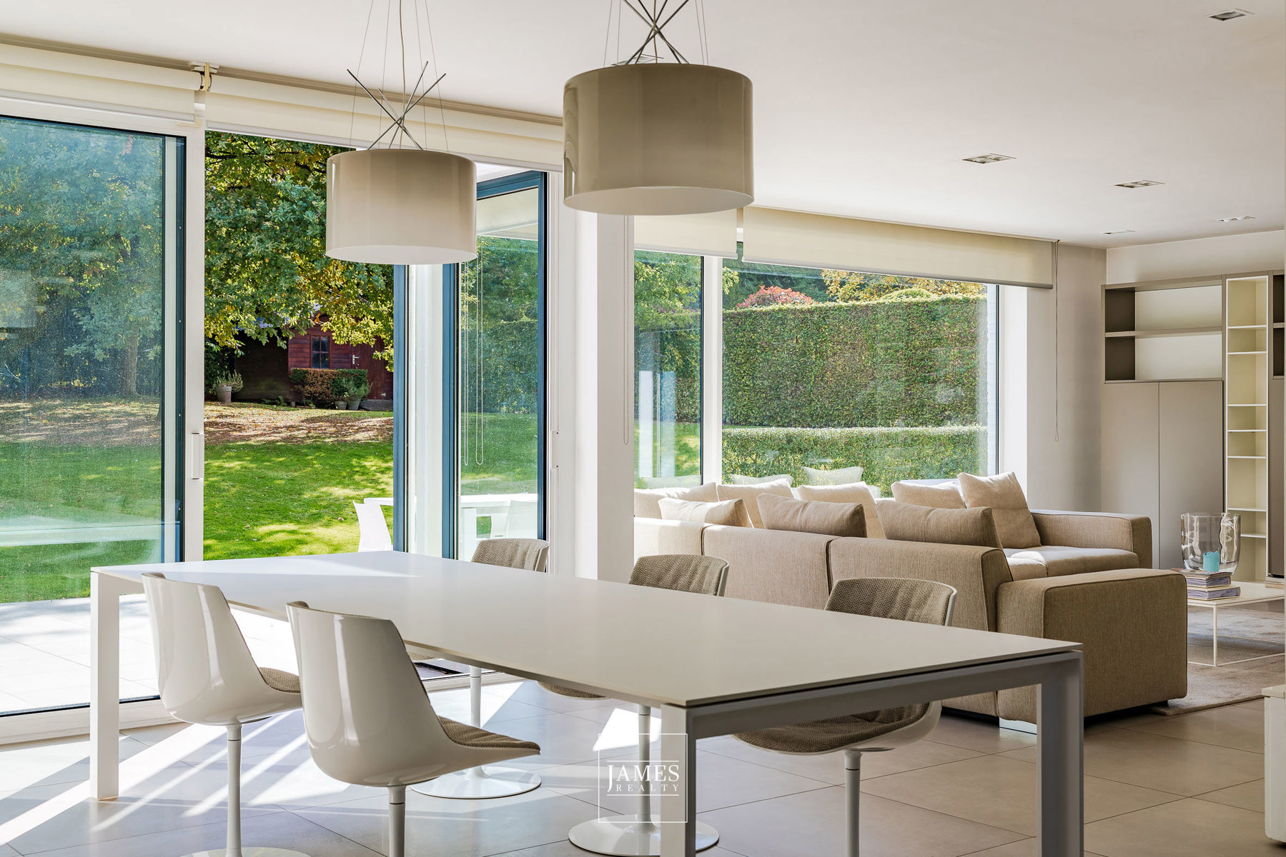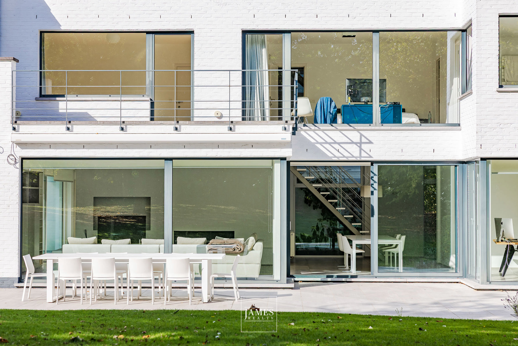 Idéalement située dans le quartier résidentiel du Prince Baudouin à Woluwe-Saint-Pierre, cette villa d’esprit moderne a été rénovée en profondeur en 2014 et développe une superficie d’environ 554 m² sur un terrain de 16 ares joliment planté et arboré avec son petit terrain de pétanque.